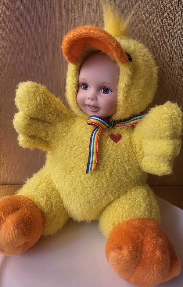 Идеальный подарок ко дню Пасхи! Золотисто-желтое плюшевое тельце и нежное фарфоровое личико этой маленькой куклы-малыша Крякер пробуждает лучшие воспоминания о детстве и рождает в душе приятное волнение. Один из очаровательных малышей-зверушек пасхальной серии "Весёлые друзья". Прекращенный выпуск 2012г.